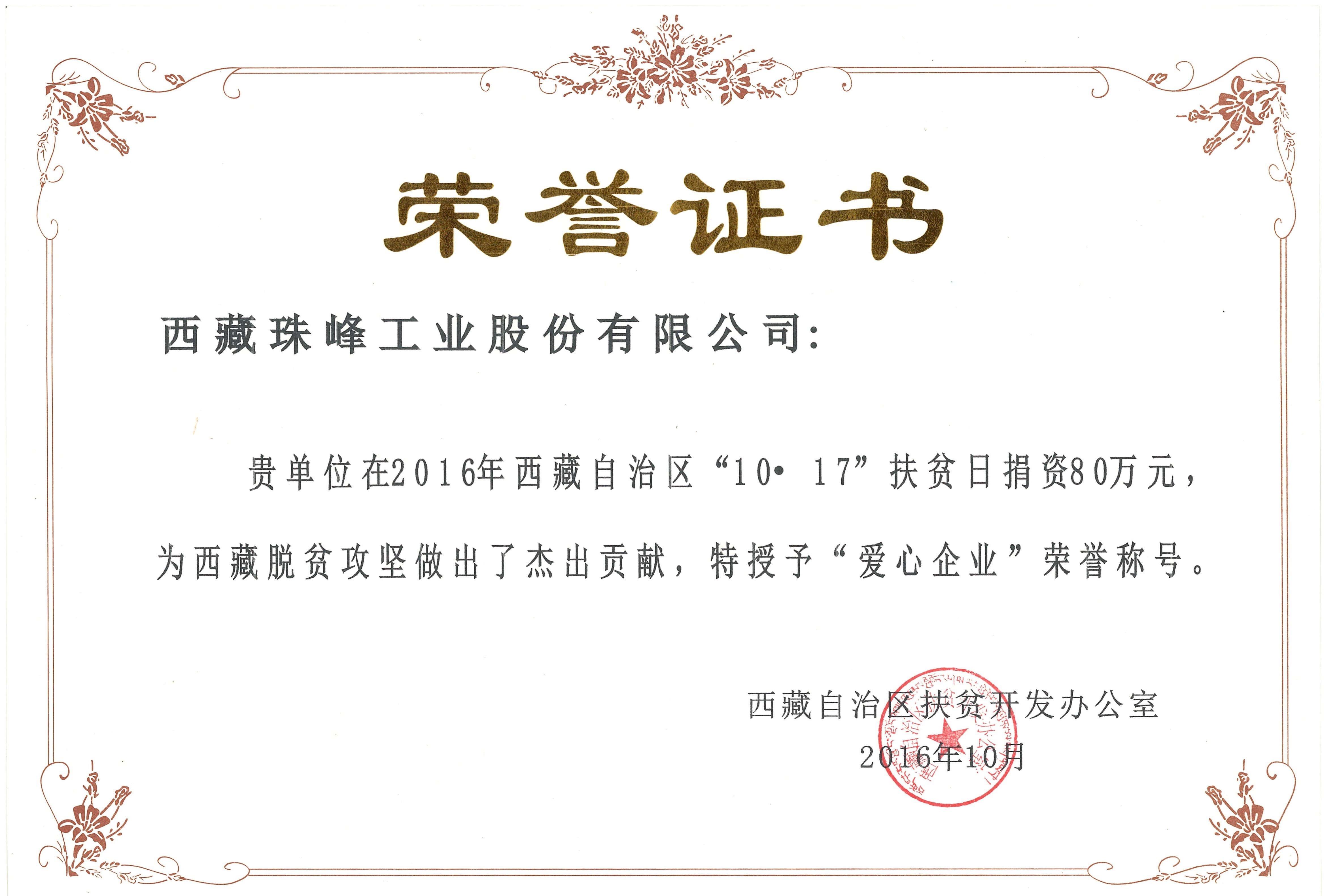 西藏自治區(qū)授予“愛(ài)心企業(yè)”稱(chēng)號(hào)